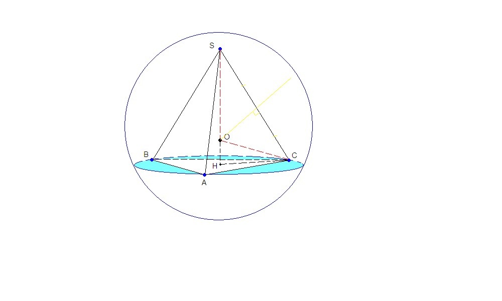 Шар описан около пирамиды, значит основание пирамиды вписано в круг - сечение шара, Н - центр основания и центр сечения, НС - радиус сечения.