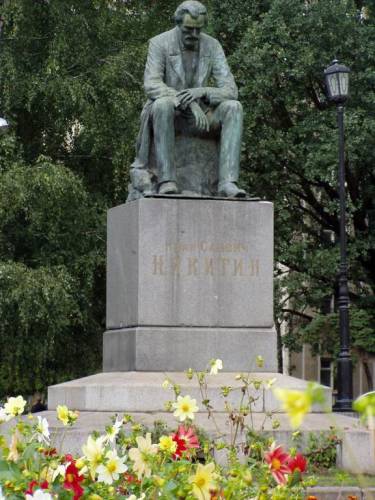 Памятник Ивану Саввичу Никитину установлен в г.Воронеже на Никитинской площади,бывшей Театральной,но переименованной в честь поэта в1918 году.Памятник перевозили в Кольцовский сквер,а потом вернули обратно.На памятнике поэт изображён сидящим в задумчивой позе - склонив голову и положив руки на колени. У ног поэта -книги.Вокруг памятника много цветов:канн,петуний,циний.У памятника хорошее освещение,необычные ограждения,много деревьев,газонной травы.Видимо,к памятнику часто приходят люди.И.С Никитин написал сборники стихотворений,поэму "Кулак",а первым его произведением было стихотворение "Русь".
