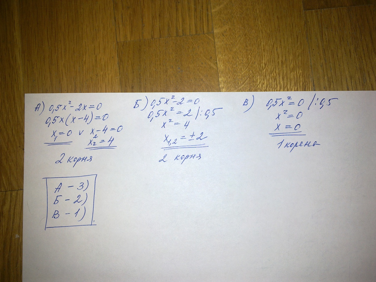 Каждое уравнение соотнесите с множеством его корней A.0,5x2 - 2x = 0 Б. 0,5x2 - 2 = 0 В. 0,5x2 = 0