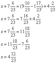 Задумано число. Если его увеличить на 7 6/23(семь целых, шесть двадцать третьих), то получится число, превышающее разность чисел 9 10/23(девять целых, десять двадцать третьих) и 1 17/23(одна целая, семнадцать двадцать третьих) на 4 2/23(четыре целых, две двадцать третьих) . Найди это число.
