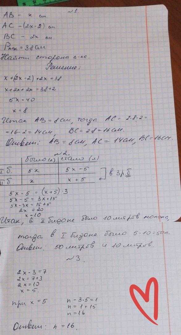 1.Периметр треугольника АВС равен 38 см. Сторона ВС в два раза больше стороны АВ, а сторона АС на 2 см меньше стороны ВС. Найдите стороны треугольника.