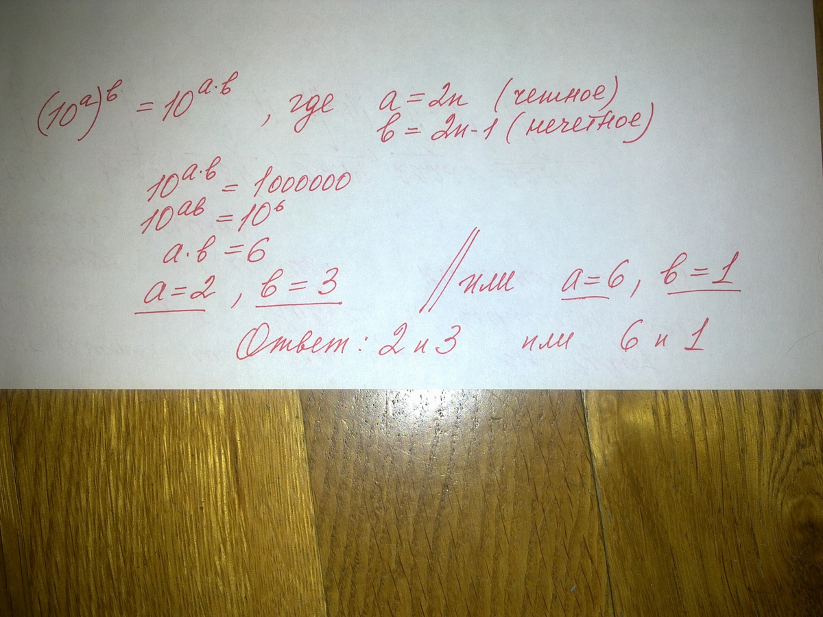 Миша вычислил степень числа 10 с покозателем а, где а-четное число. Его сестра возвела число, полученое Мишей в степень с показателем b, где b-нечетное число. Она получила 1000000. Найдите хотя бы одну пару значений a и b, которые могли использовать Миша и сестра.