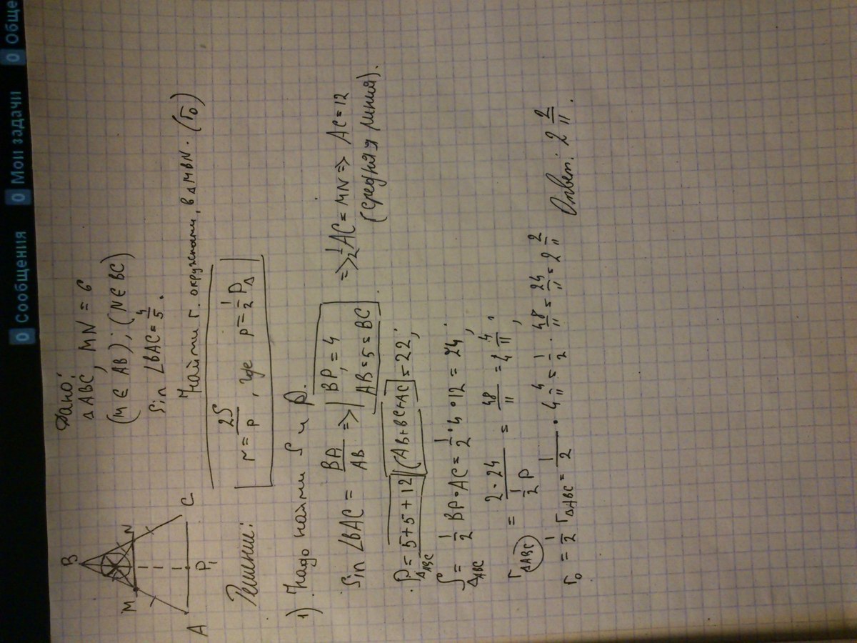 В равнобедренном треугольнике ABC длина средней линии MN равна 6, а sin угла BAC=4/5. Найдите радиус окружности, вписанной в треугольник MBN