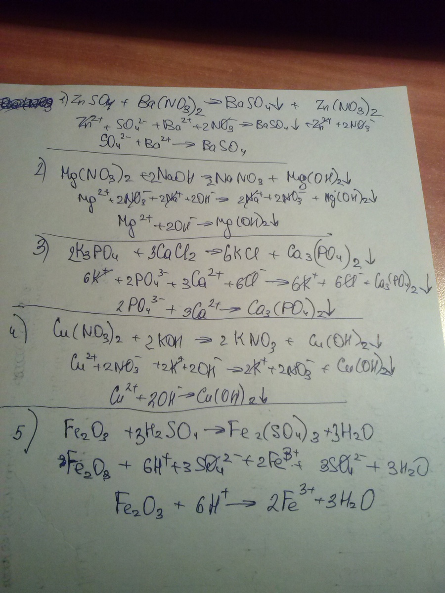 Помогите пожалуйста с химией!!! Напишите молекулярное, полное и сокращенное ионные уравнения реакций между растворами следующий веществ: а) сульфат цинка и нитрат бария б) нитрат магния и гидроксид натрия в) фосфат калия и хлорид кальция г) нитрат меди (II) и гидроксид калия д) оксид железа (III) и серная кислота.