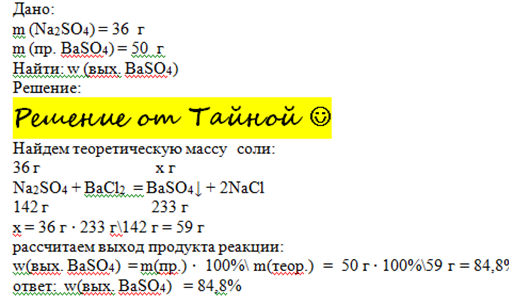 При взаимодействии BaCl2 c Na2So4 массой 36 г образовался осадок массой 50 г. Определить массовую долю выхода осадка.