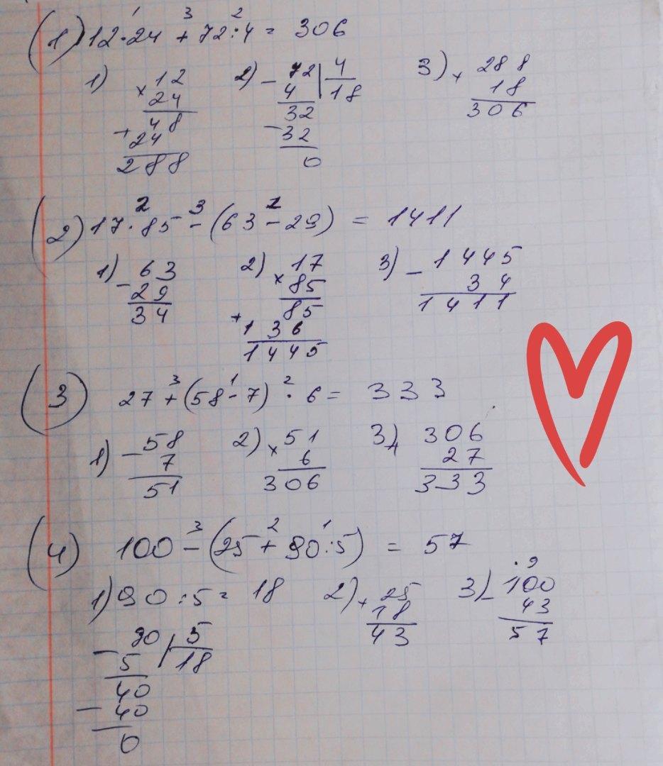 какий порядок действий                                                                                        12*24+72:4=                                                                                                                        17*85-(63-29)=                                                                                                                       27+(58-7)*6=                                                                                                                         100-(25+90:5)=