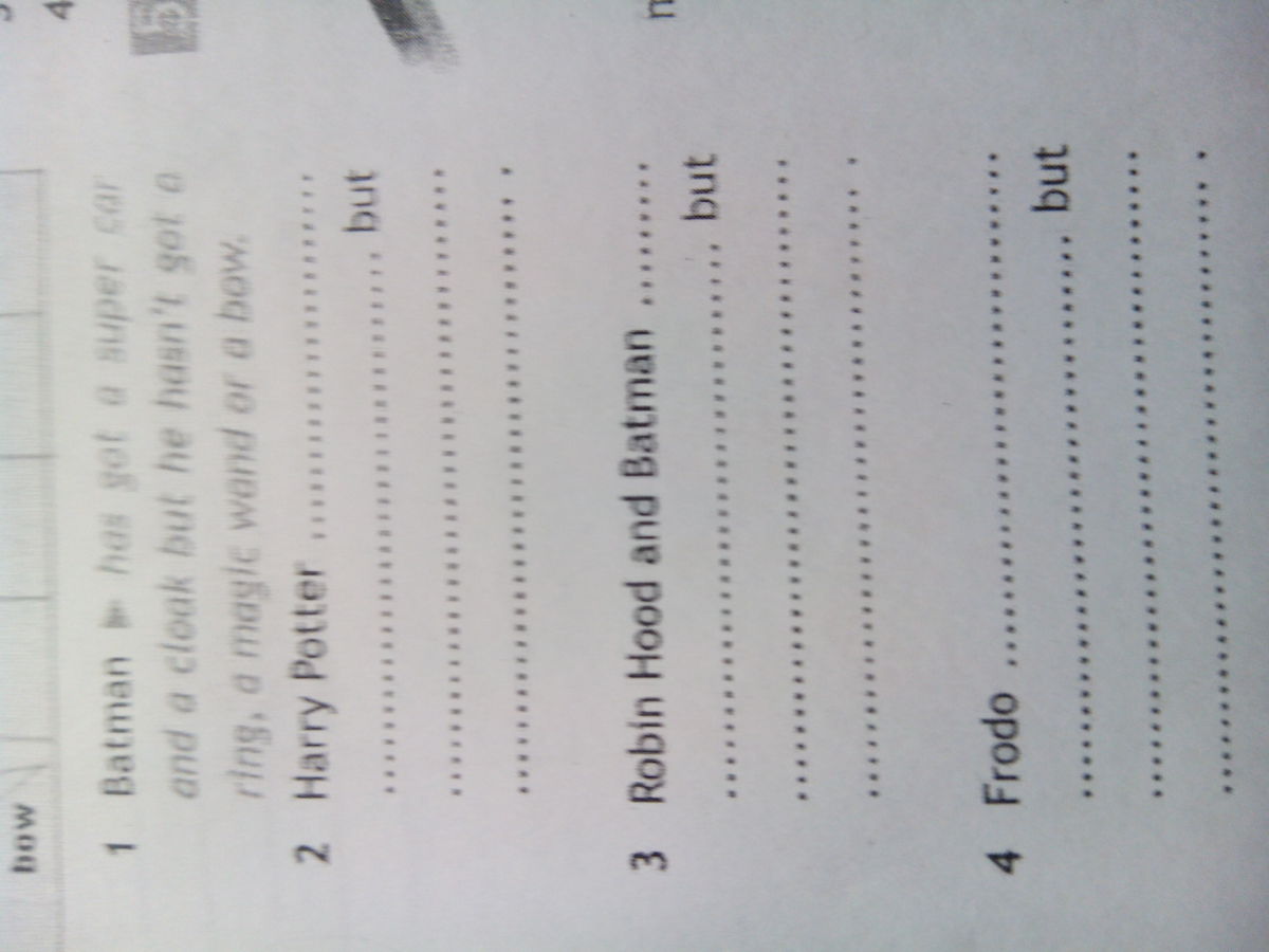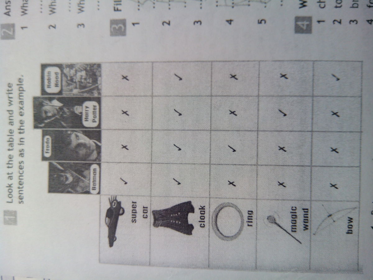 RH has got a cloak, a magic wand and a bow, but he hasn't got a super car, a ring or a magic wand.