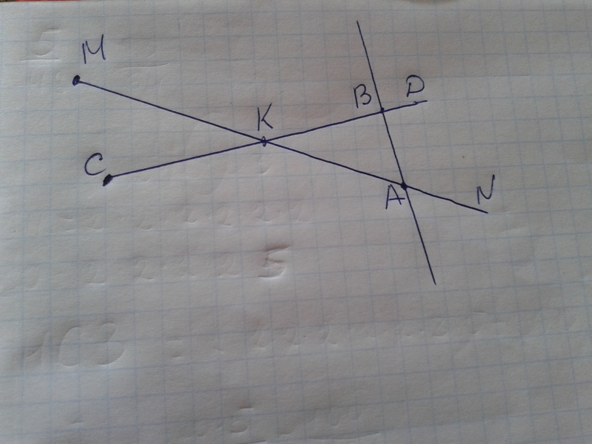 Выполните рисунок по описанию: Лучи MN и CD пересекаются в точке K. Прямая AB пересекает лучи MN и CD в точках A и B