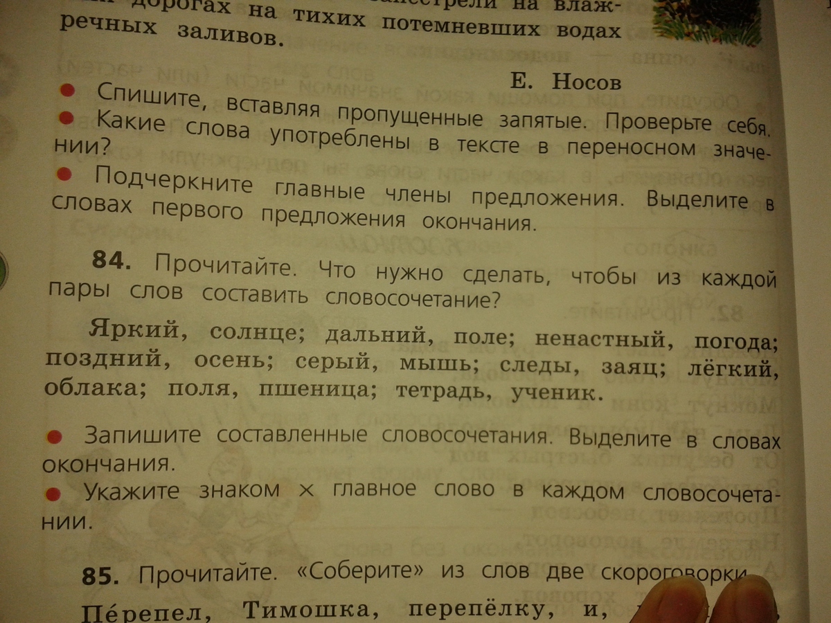 тетрадь ученикА. большими буквами написаны окончания. главные слова: солнце,поле,погода,мышь,следы,облака,поля,тетрадь