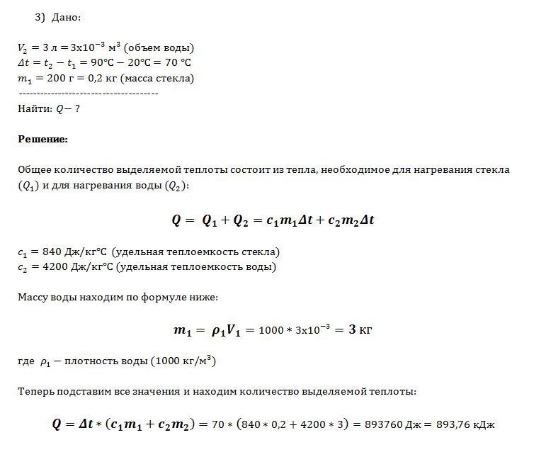 3.3-литровая стеклянная банка массой 200 грамм с горячей водой, температура которой 90 °С остывает до 20°С. Считая температуру банки равной температуре воды, расчитайте, какое выделяется количество теплоты?