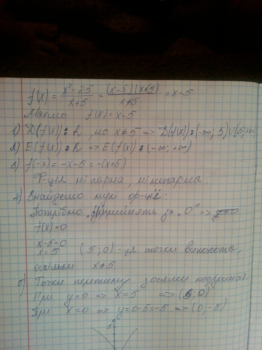 x^2-25/x+5 знайти область визначення, знайти область значень, дізнатися про парність чи непарність, знайти нулі функції; точки перетину графіка з осями координат. Помогите пожалуйста!!!!!! прошу!!!