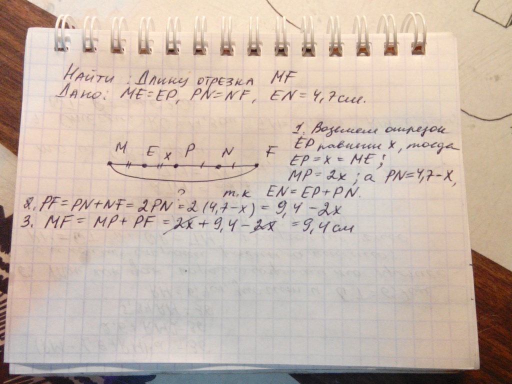 Точка P лежит между точками M и F ,точки E и N-середины отрезка MPи PF. Найдите длину отрезка MF, если EN=4,7 см.