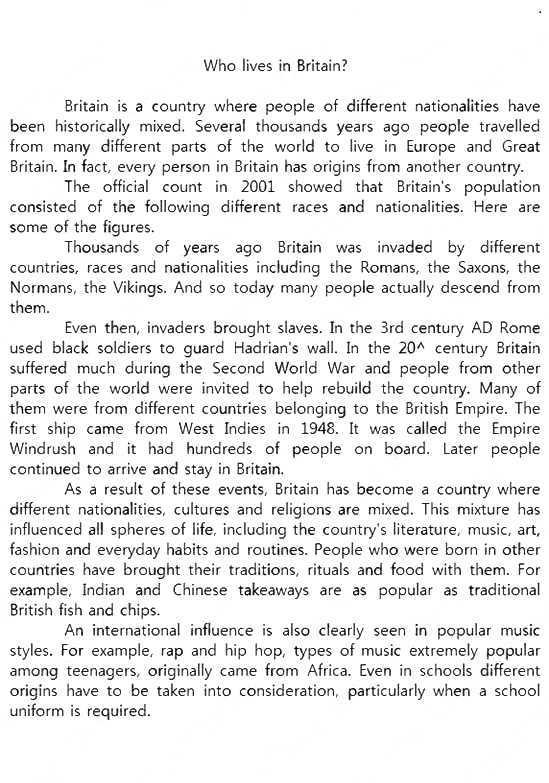 Who lives in Britain? Britain is a country where people of different nationalities have been historically mixed. Several thousands years ago people travelled from many different parts of the world to live in Europe and Great Britain. In fact every person in Britain has origins from another country. The official count in 2001 showed that Britain's population consisted of the following different races and nationalities. Here are some of the figures. Thousands of years ago Britain was invaded by different countries, races and nationalities including the Romans, the Saxons, the Normans, the Vikings. And so today many people actually descend from them. Even then, invaders brought slaves. In the 3rd century AD Rome used black soldiers to guard Hadrian's wall. In the 20A century Britain suffered much during the Second World War and people from other parts of the world were invited to help rebuild the country. Many of them were from different countries belonging to the British Empire. The first ship came from West Indies in 1948. It was called the Empire Windrush and it had hundreds of people on board. Later people continued to arrive and stay in Britain. As a result of these events, Britain has become a country where different nationalities, cultures and religions are mixed. This mixture has influenced all spheres of life, including the country's literature, music, art, fashion and everyday habits and routines. People who were born in other countries have brought their traditions, rituals and food with them. For example, Indian and Chinese takeaways are as popular as traditional British fish and chips. An international influence is also clearly seen in popular music styles. For example, rap and hip hop, types of music extremely popular among teenagers, originally came from Africa. Even in schools different origins have to be taken into consideration, particularly when a school uniform is required.А теперь пожелай мне добра:D