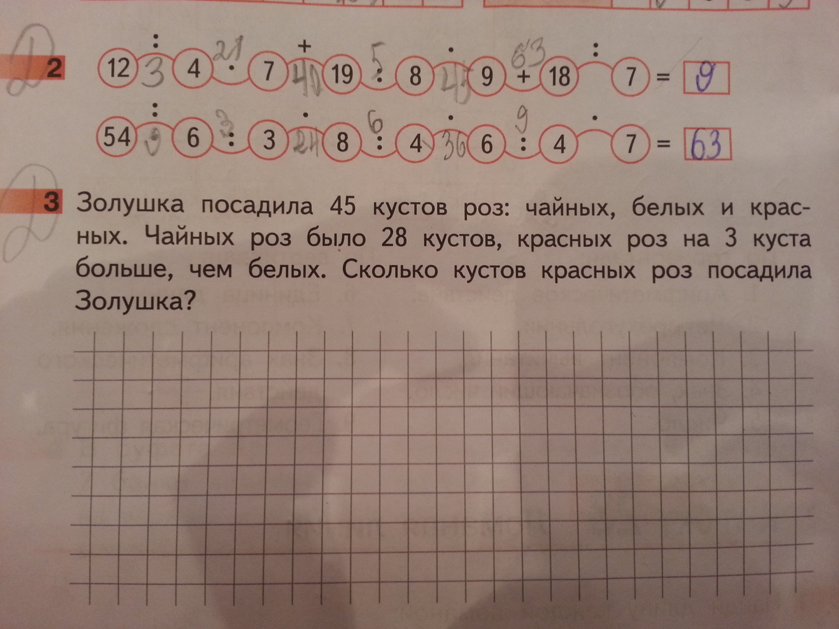 золушка посадила 45 кустов роз:чайных,белых,и красных.Чайных роз было 28 кустов,красных роз на 3 куста больше,чем белых.Сколько кустов красных роз посадила Золушка?