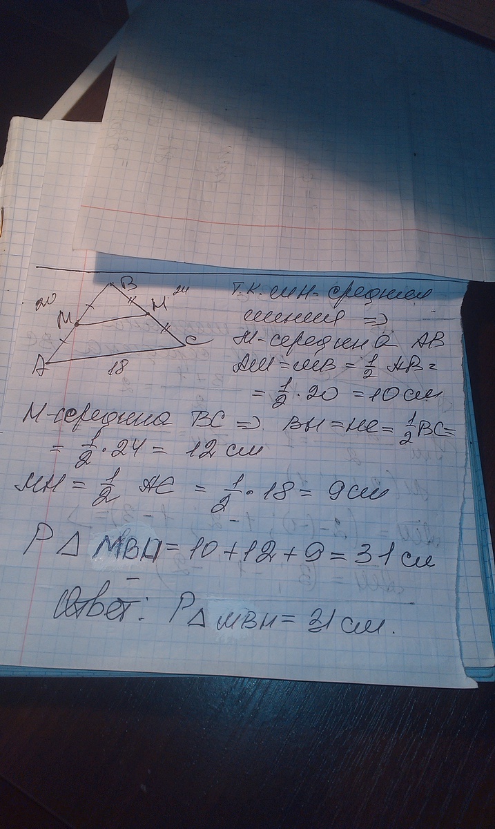 в треугольнике АВС отрезок МН-средняя линия. АВ=20 см, ВС=24см, АС=18см. МНпоралельна АС. Найти периметр треугольника МВН