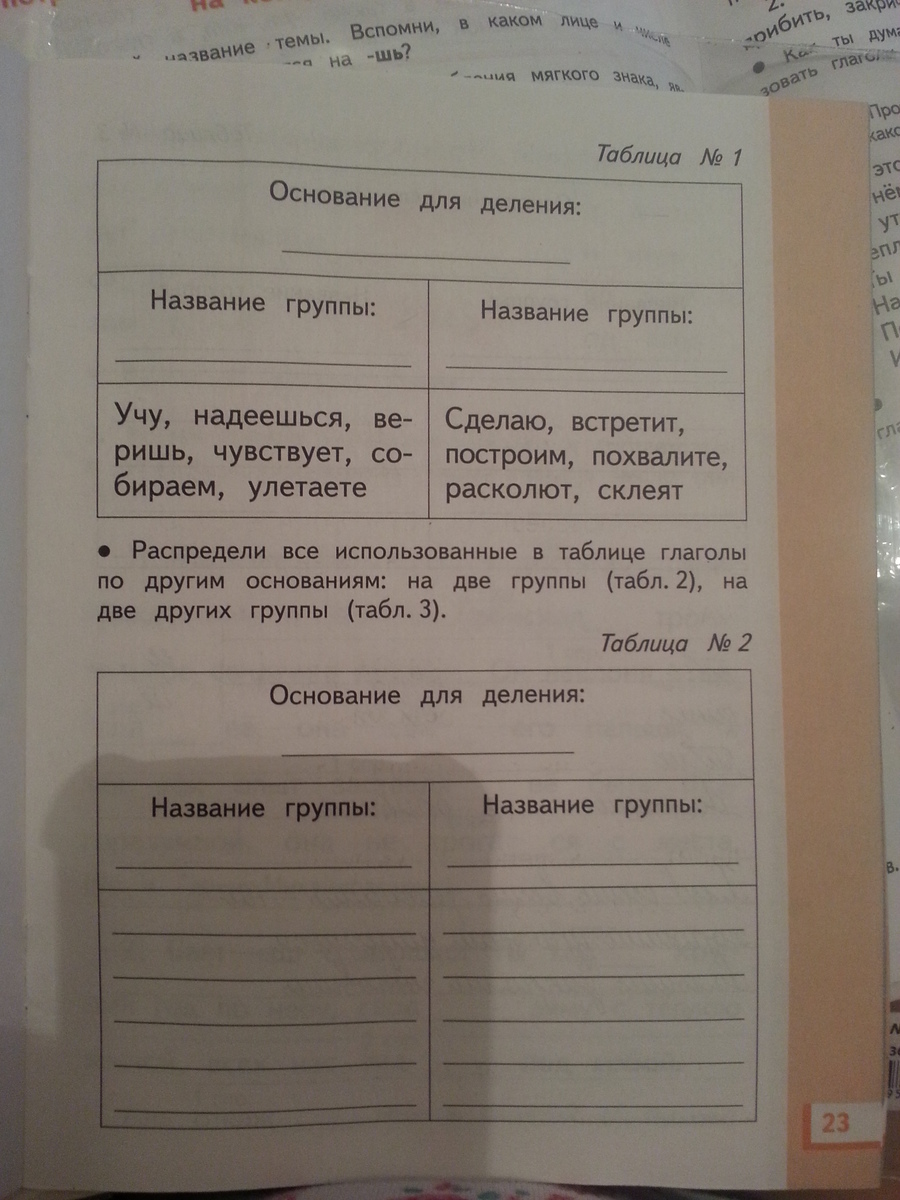 Рассмотри таблицу №1.Что служит основанием деления глаголов на группы?Запиши основание и названия этих групп.