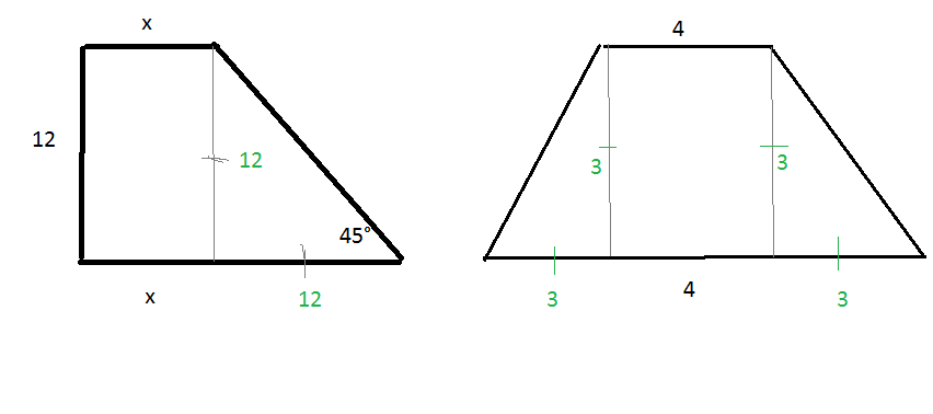 Обозначим верхнее основание х, тогда нижнее основание (х+12)