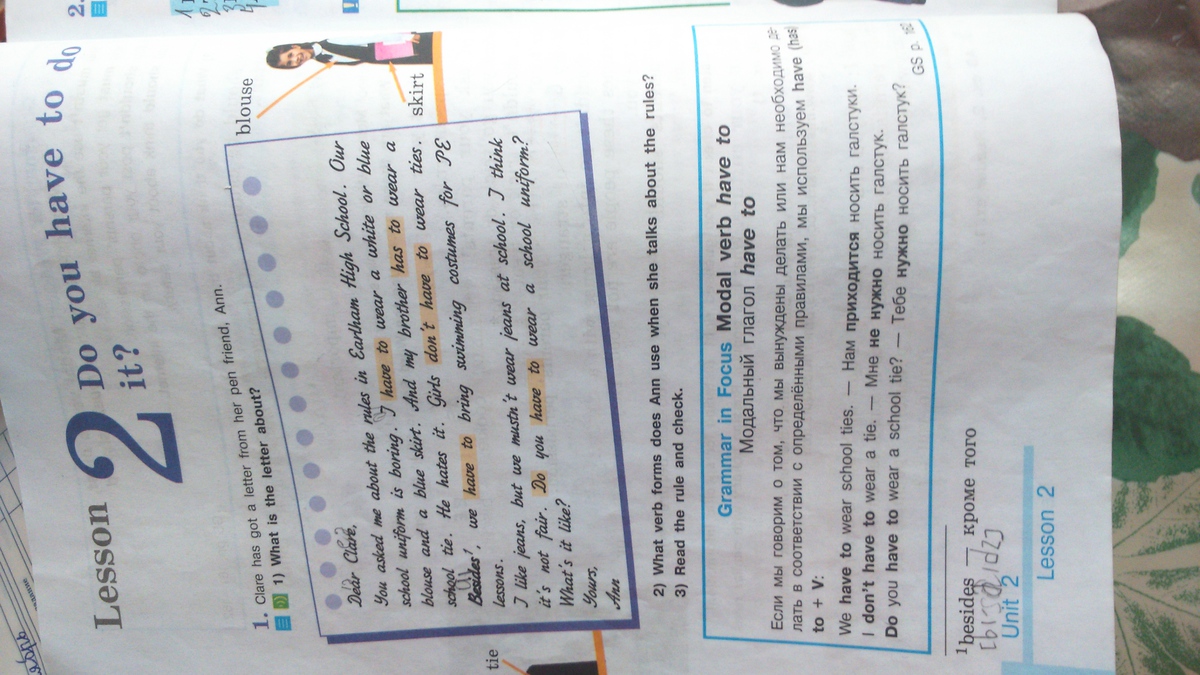 ты спрашивала меня о правилах в Эртемской средней школе. Наша форма скучная. Я должна носить белую блузку голубую юбку . А мой брат должен носить школьный галстук. Он ненавидит это. Девочки не должны носить галстук. Потому что мы должны одевать купальники на уроках физкультуры. Я люблю джинсы, но мы не можем одевать джинсы в школу . Я считаю это нечестно. Есть ли у тебя школьная форма? Как она выглядит?/ На что она похожа?