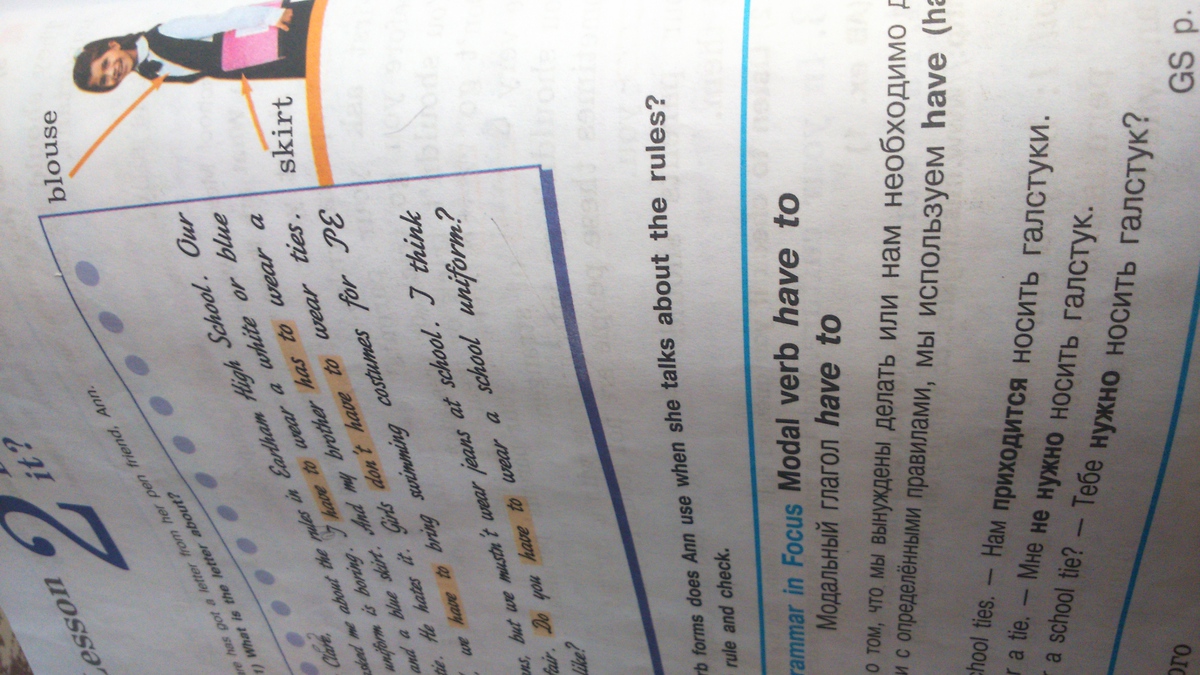 ты спрашивала меня о правилах в Эрхамской Высшей школе. у нас скучная школьная форма. мне приходится носить белую или голубую блузку и голубую юбку. и мой брат должен носить галстук. он ненавидит его. девочкам не нужно носить галстуки. кроме того, нам приходится носить плавательные костюмы на физ-ру.