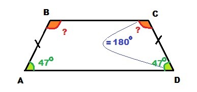 СУММА ДВУХ УГЛОВ РАВНОБЕДРЕННОЙ ТРАПЕЦИИ РАВНА 94 ГРАДУСА.
