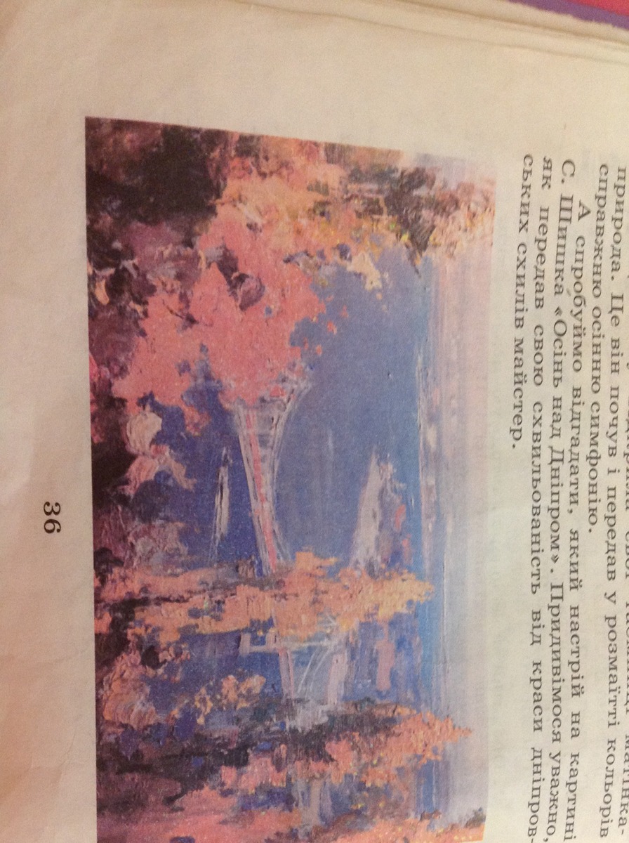 озглядаючи картину С. Шишка, мені здається, що я – птах…Високо над Дніпром відчуваю, як прохолодний вітерець дме в обличчя, шурхотить внизу листям на високих тополях. Ніби знялось полум’я на обох берегах Дніпра – то осінь запалила фарбами листя дерев.Широка ріка, мов жива істота, невпинно несе свої холодні води, зачаровує мене своєю темною блакиттю… Такий знайомий мені міст, ніби пояс, підперезав Дніпро…Недовго лишилося бачити цю красу – наближається біла, холодна зима… Вона, мов господиня, вкриє усе навколо теплою ковдрою із пухнастого снігу.Кожну картину треба бачити так, наче ти опиняєшся там і бачиш усе своїми очима, відчуваєш і чуєш усе, що навкруги. Тільки так можна з’ясувати, що ж саме хотів передати художник.