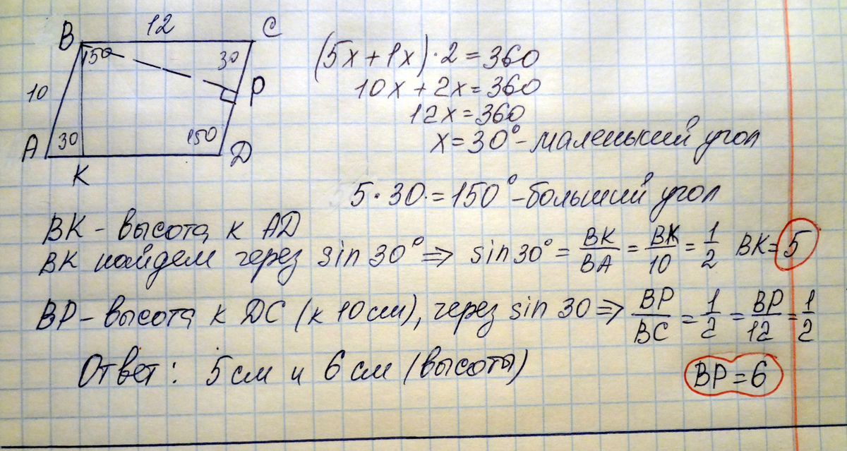 найдите длины сторон высот параллелограмма, если известно, что стороны равны 10 см и 12 см, а углы относятся, как 5:1