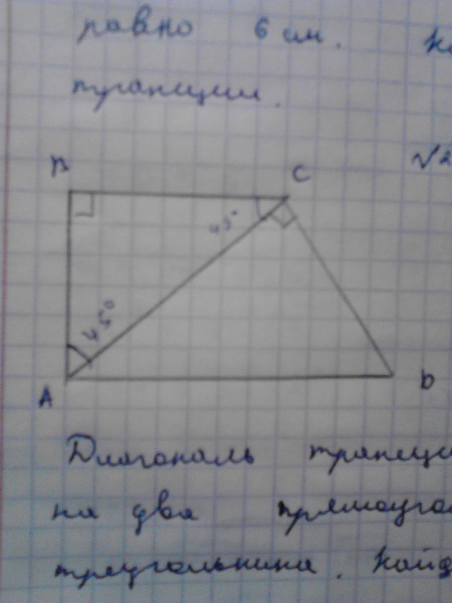 диагональ трапеции abcd делит ее на два прямоугольных равнобедренных треугольника найдите среднюю линию трапеции если площадь трапеции равна 36 см