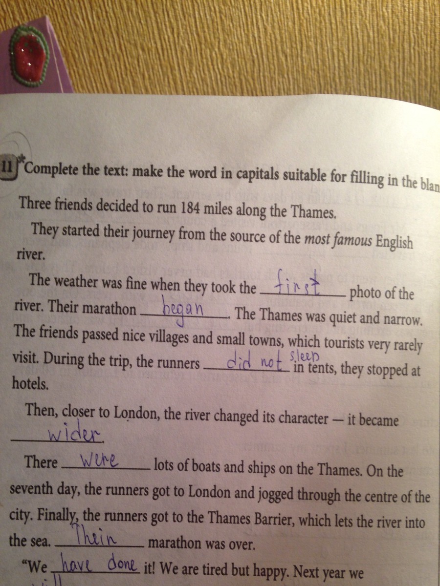 Погода была хорошей когда они сделали первое фото реки. Их марафон начался. Тэмза была тихой и спокойной. Друзья проходили милые (красивые) деревни и маленькие города, которые туристы очень редко посещали. Во время поездки (путешествия), бегуны не спали в палатках, они остановливались в отелях.