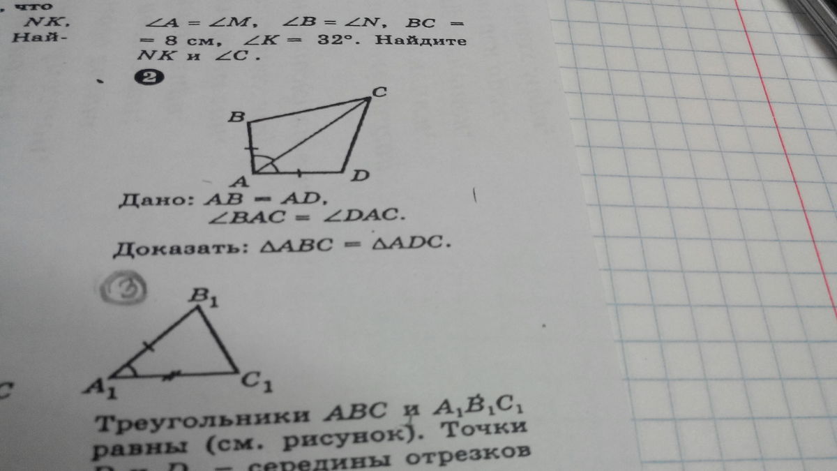 треугольники АВС = ДАС по первому признаку (АВ=АД,и углы АВС=АДС,АС-общая сторона)это же самое элементарное!Только я не помню,первый это признак или второй,не напомнишь?)