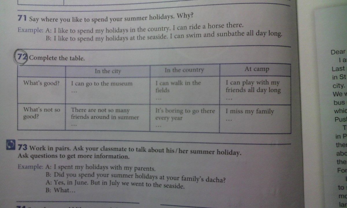 what is good. In the city - I can go to the cinema; In the country - I can swim in the river; In the camp - I can have more friends