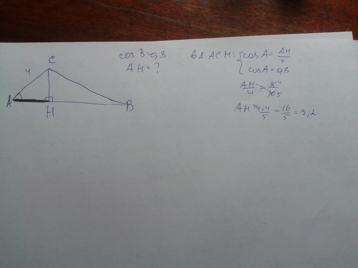 в треугольнике аbc угол с=90 градусов, сos A=0.8 ac=4 отрезок сh- высота треугольника abc. найдите аh