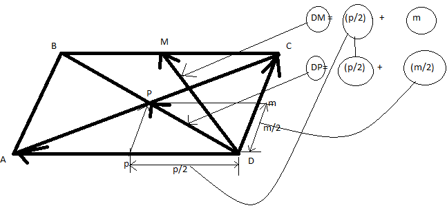 в параллелограмма ABCD P-точка пересечения диагоналей,M-середина BC. ввразите векторы DP и DM через вектора DA=P и DC=m