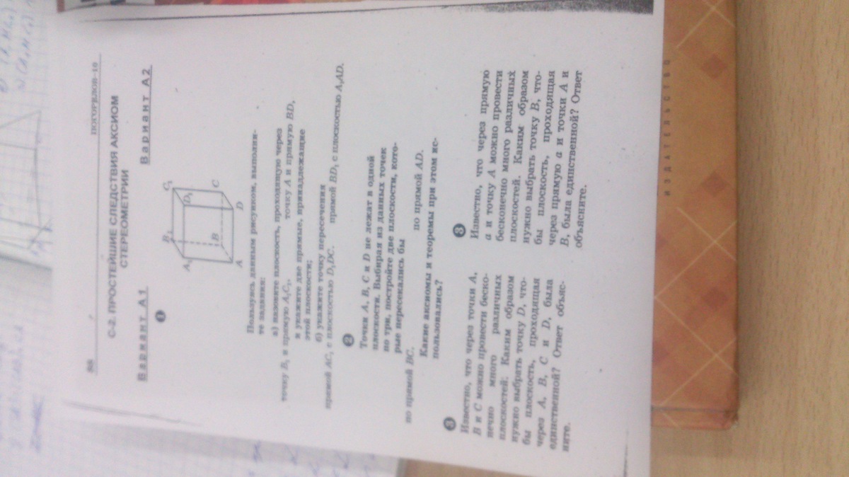 3. По условию через прямую а и точку А можно провести бесконечно много плоскостей ⇒А∈а. Ставим точку В вне прямой А и получаем, что по первой аксиоме стереометрии(через точку не лежащую на прямой и эту прямую можно провести плоскость и притом только одну), существует только единственная пл-сть α| В∈α и а, а соответственно и точка А, принадлежат α.