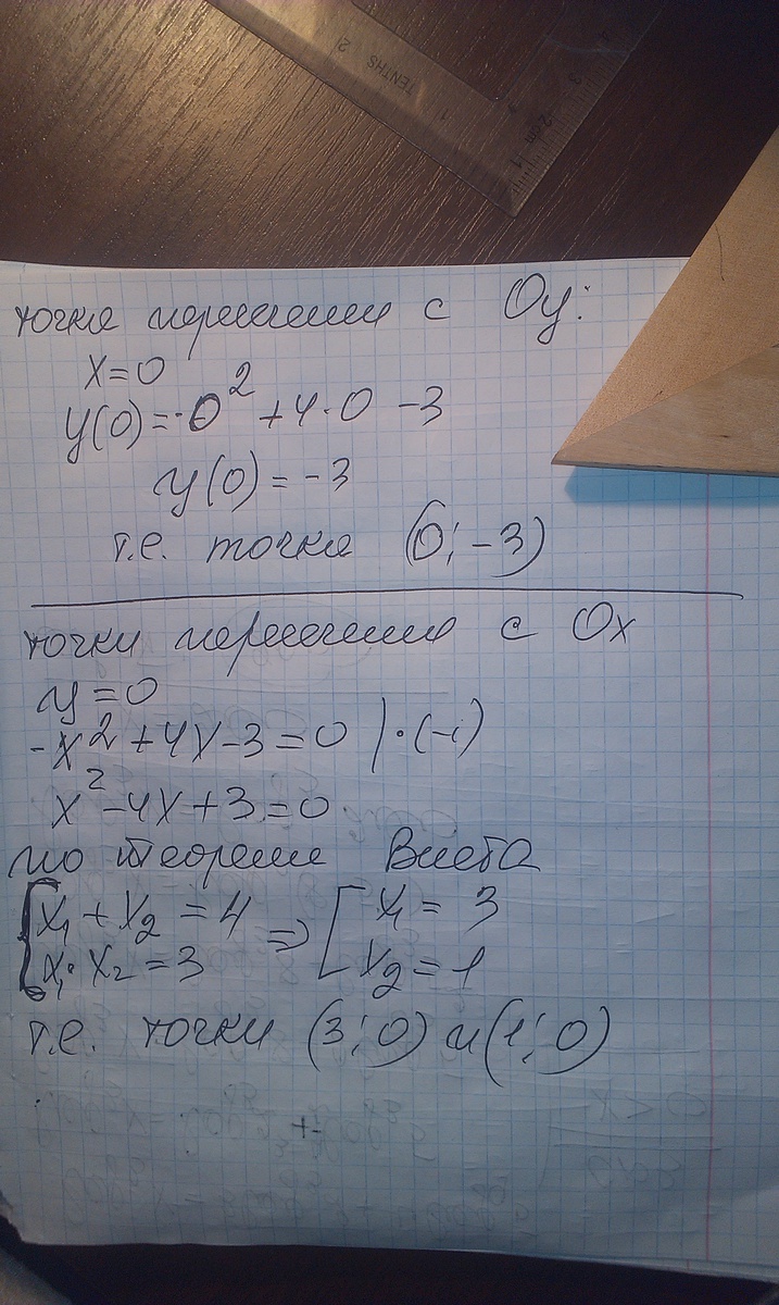 -x^2+4x-3=0 находим корни: х1=(-4+2)/(-2)=1 х2=(-4-2)/(-2)=3, получаем перевернутую параболу(коэф. а=-1, т.е.<0), с точками пересечения оси х в точках 1 и 3.