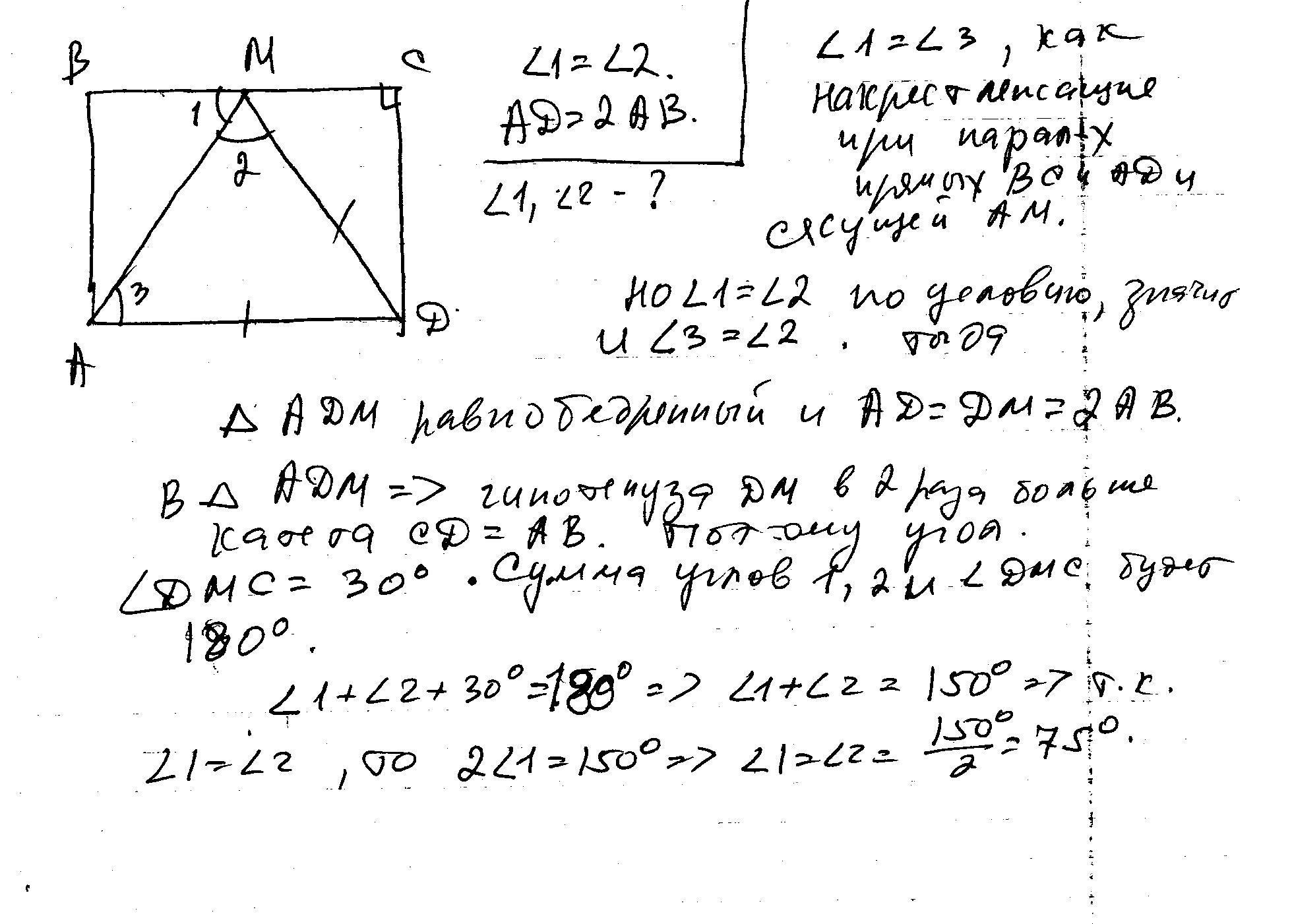 В прямоугольнике ABCD на стороне BC взята точка М так, что угол AMB равен углу AMD. Найдите эти углы, если AD=2AB.