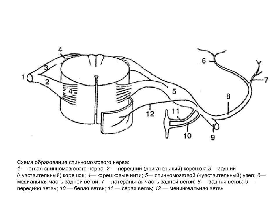 Спинномозговые нервы в количестве 31 штуки отходят непосредственно от спинного мозга и по составу являются смешанными,так как формируются в результате слияния двигательных волокон от переднего корешка и чувствительных от заднего. На заднем корешке располагается чувствительный узел спинномозгового нерва,содержащий тело первого чувствительного нейрона рефлекторной дуги. По выходу из межпозвоночного отверстия каждый спинномозговой нерв делится на три ветви: 1)менингеальную,иннервирующую оболочки спинного мозга; 2)заднюю,иннервирующую заднюю поверхность тела,преимущественно кожу и мышцы спины и 3)переднюю,образующую сплетения -- шейное,плечевое,поясничное,крестцовое и копчиковое,иннервирующие соответствующие области. Также от некоторых спинномозговых нервов отходит соединительная ветвь,обеспечивающая их контакт с симпатическим стволом.