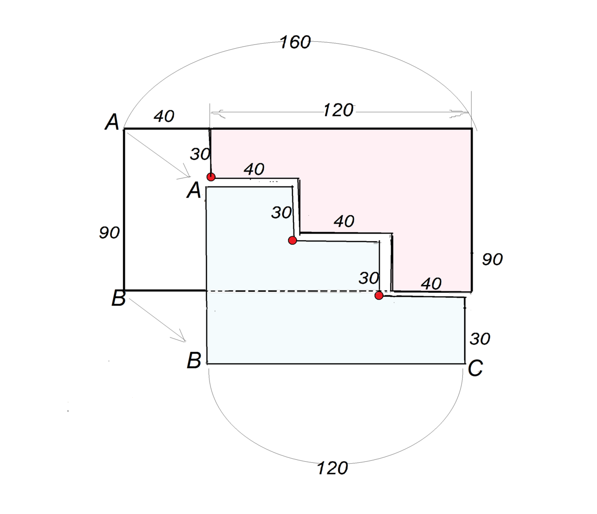 Затем получившиеся части сложить, сдвинув одну из них вниз и вправо. . Получится квадрат размером 120см ×120 см