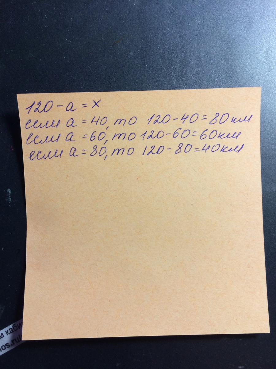 Мотоцикл едет из города в село,расстояние до которого 120 км. Сколько километров ему осталось проехать , если он уже проехал a км? Составьте выражение и найдите его значение при a= 40; 60; 80.