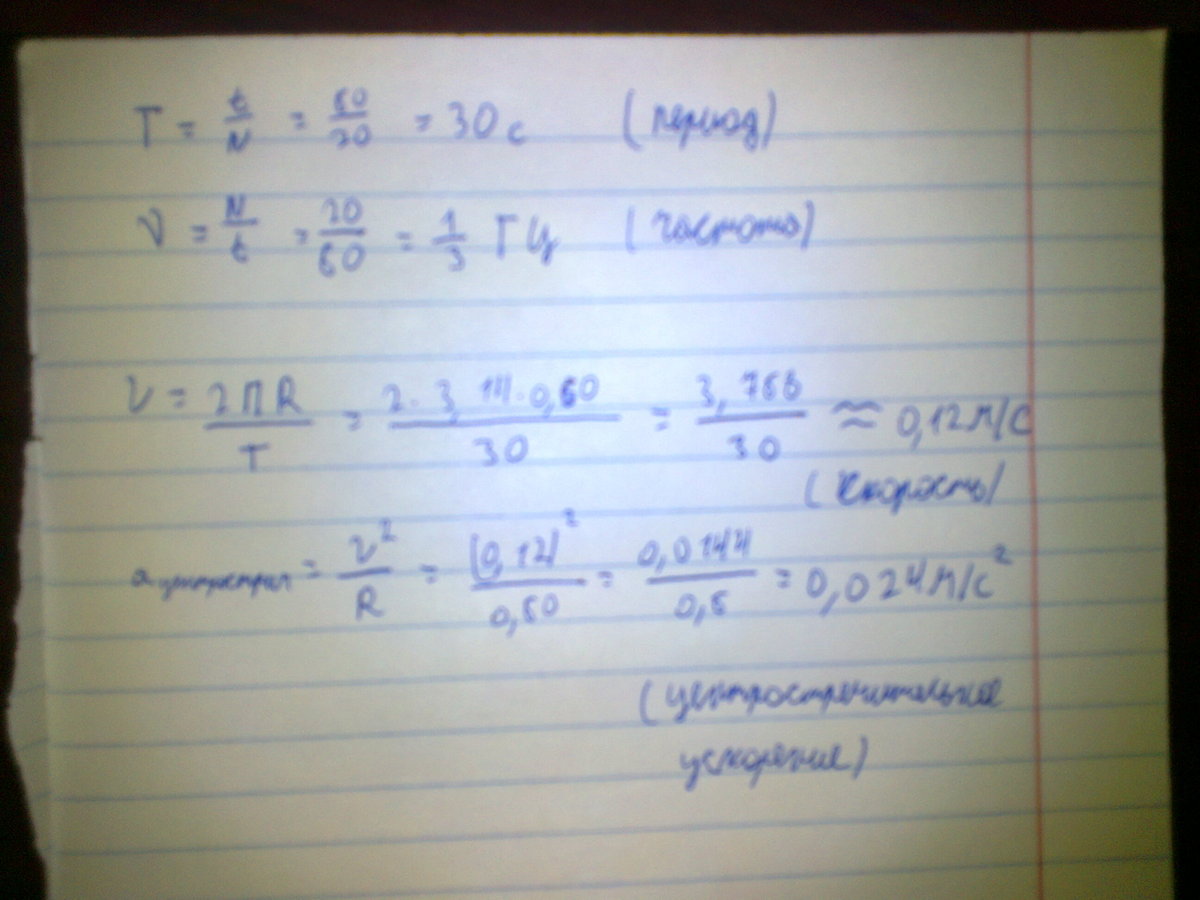3 задача Колесо,радиус которого 60 см,совершает 20 оборотов за 1 минуту.Вычеслите период и частоту обращения,скорость и центростремительное ускорение колеса.