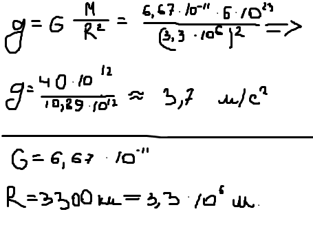масса марса 6 * 10 23 кг, его радиус 3300км. Вычислите ускорение свободного падения тела на поверхности Марса