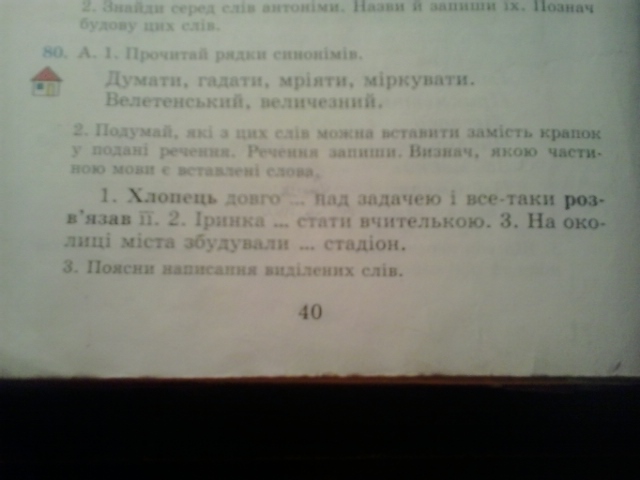 1.Хлопець довго міркував над задачею і все таки розв*язав її. Іринка мріє стати вчителькою. На околиці міста збудували велечезний стадіон. 2. Будинок-дім оселя домівка. Домівку ти не покидай а як покинеш-зрадиш край. Шлях-дорога стежка траса шосе. Дорогою до школи я побачив маленьке кошеня. Сміливий-хоробрий безстрашний. Васько-дуже хоробра людина. Говорити-балакати розмовляти теревенити ляси точити. Ці дві дівчинки теревенять як баби базарні.