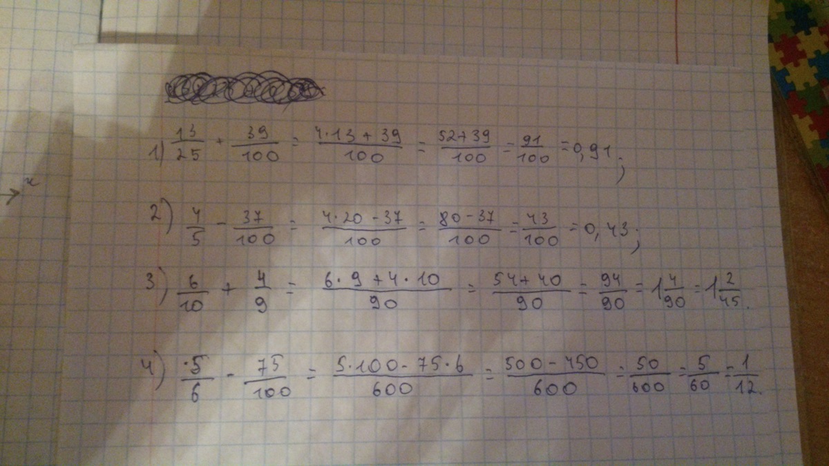 Первые три решены правильно.А вот четвертое : 5/6 - 75/100=(5*50 - 75* 3)/300=(250-225)/300=25/300=1/12.