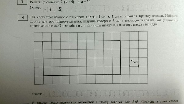 На клетчатой бумаге с размером клетки 1см на 1см изображен прямоугольник.Найдите длину другого прямоугольника,ширина которого 3 см, а площадь такая же,как у данного прямоугольника. Ответ дайте в см.