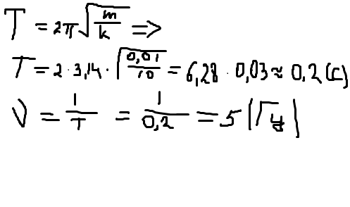 Шарик массой 10 г подвешен к пружине жесткостью 10 Н/м. Определите частоту и период колебаний шарика
