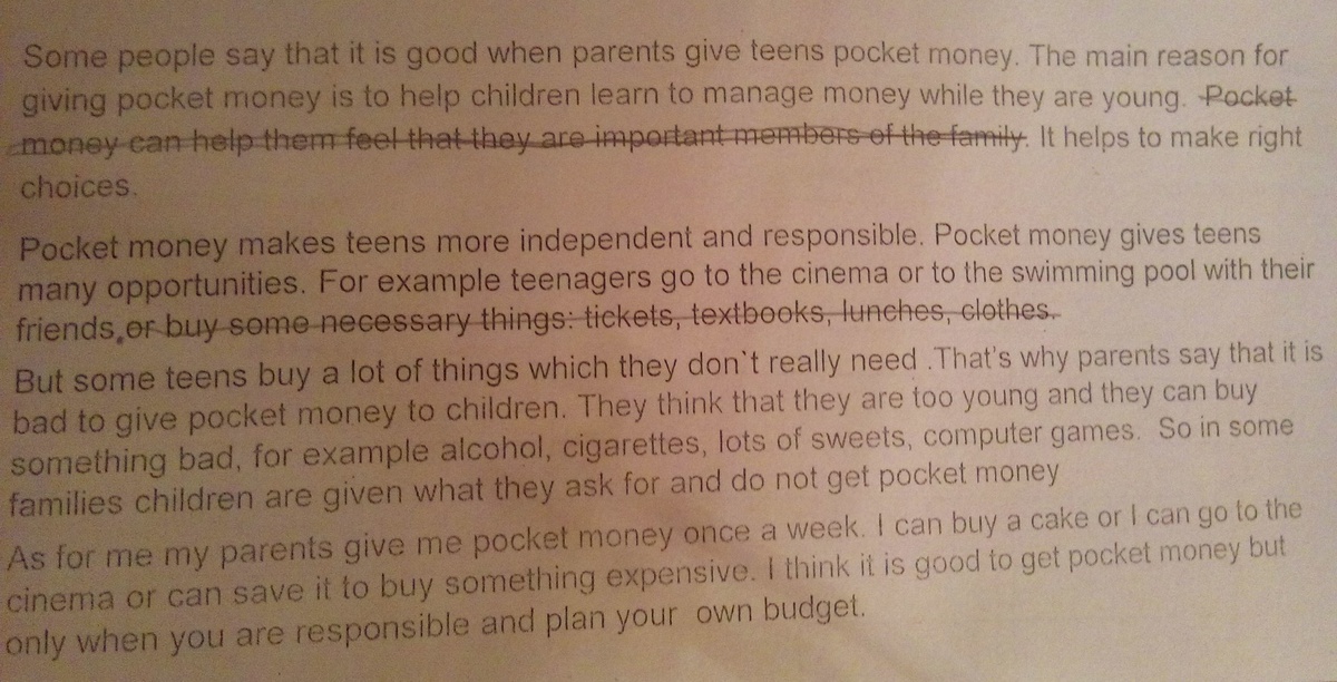Некоторые люди считают, что давать подросткам карманные деньги, приемлево! Благодоря этому, дети чувствуют себя более взрослыми и независимыми . На пример, подростки сами могут пойти в кино или в босеен со своими друзьми. Но многие подростки тратят деньки в пустую, покупая ненужные вещи . Тинейджеры начинают покупать алкоголь, сигареты и прочее... По этому в некоторых семьях с детьми нету такого понятия как карманные деньги. Что касаеться меня, родители дают мне карманные деньги каждую неделю. Я могу купить себе пероженое или некоторые вещи в которых я нуждаюсь . Я считаю, давать карманные деньги хорошо.)