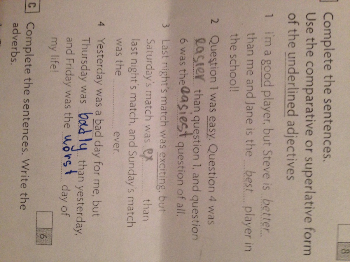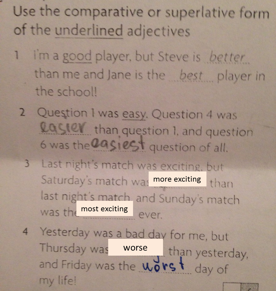 1 и 2-правильно. 3-more exciting, the most excitng. 4- worst а не badly