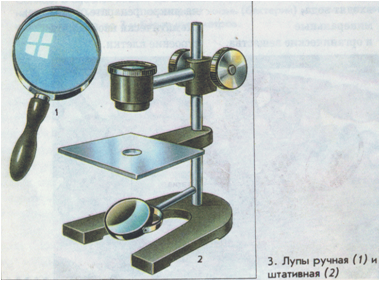 в приложении: 1 - ручная лупа. 2- штативная лупа