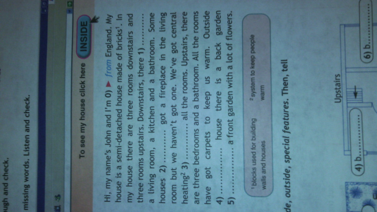 Привет, меня зовут Джон и я из Англии. Мой дом двухквартирный, построен из кирпича. В моем доме три комнаты внизу и три комнаты наверху. На первом этаже гостиная комната, кухня и ванная комната. В некоторых домах есть камин в гостиной, но у нас его нет. У нас центральное отопление во всех комнатах. На втором этаже три спальни и ванная комната. Во всех комнатах есть ковры, чтобы сохранять тепло.Наулице возле дома есть задний сад и передний сад, где есть множествоцветов.