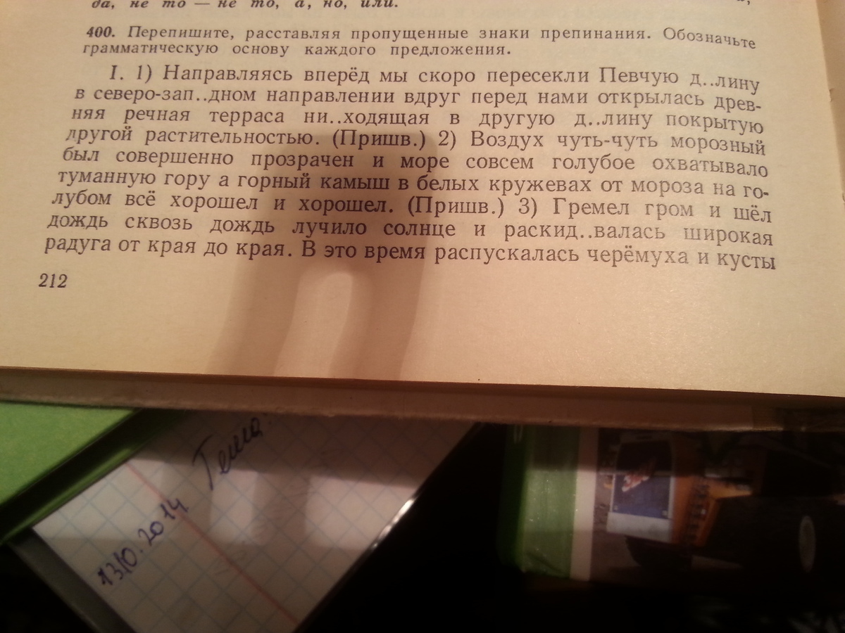 Направляясь вперед, мы - скоро пересекли = певчую долину в северо-западном направлении; вдруг перед нами открылась= древняя речная терраса-, нисходящая в другую долину, покрытую другой растительностью. Воздух- , чуть-чуть морозный, был = совершенно прозрачен= , и море - , совсем голубое, охватывало= Туманную гору, а горный камыш - , в белых кружевах от мороза на голубом все хорошел= и хорошел =. Гремел = гром - , и шел = дождь -, сквозь дождь лучило= солнце - , и раскидывалась = широкая радуга - от края до края. В это время распускалась = черемуха - , и кусты - дикой смородины над самой водой позеленели=. Заря - разгоралась =за окнами, и в свете ее стоял= сад - , засыпанный цветами мокрого снега. Грачи - закричали = за рекой в ветвях, и повсюду – в кустах и в траве – запели=, зачирикали= птицы -. . Снег- истоптан =, смешан= с грязью , и только на огородах и на полях, залитый сиянием холодного осеннего солнца, он- сверкает = снежной белизной. За горами занималась = уже. вероятно, заря- , но сюда, в глубокую теснину, свет -чуть-чуть проломился = , и темнота - становилась = молочной =.