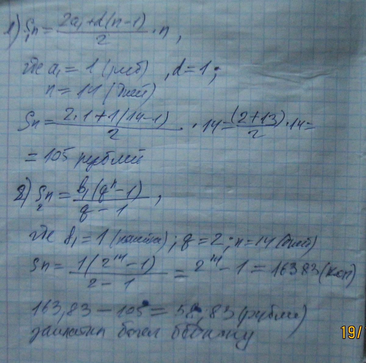 Однажды умный бедняк попросил у скупого богача приюта на 2 недели, причём сказал: «За это я тебе в первый день заплачу 1 руб. , во второй день – 2 руб. , в третий – 3 руб. и т. д. Ты же будешь подавать мне милостыню: в первый день – копейку, во второй день – 2 к. , в третий – 4 к. , в четвертый – 8 к. и т. д.» . Богач с радостью согласился на такие условия. Какой барыш принесла эта сделка богачу?